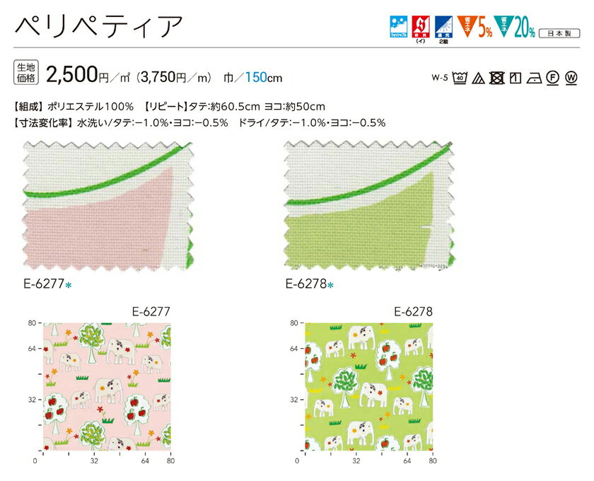 商品名スミノエ Faceカーテン スタンダード縫製 約1.5倍ヒダタテ使い キッズシリーズ ペリペティア E-6277〜6278素材ポリエステル100%備考日本製(生地価格)2,500円/m2 3,750円/m(リピート)タテ:約60.5cmヨコ:約50cm寸法変化率:(水洗い)タテ:-1.0% ヨコ:-0.5%(ドライ)タテ:-1.0% ヨコ:-0.5%組成:ポリエステル100%巾:150メーカー希望小売価格はメーカーカタログに基づいて掲載しています送料について離島や中継手数料の発生する地域は、別途地域料が必要です。